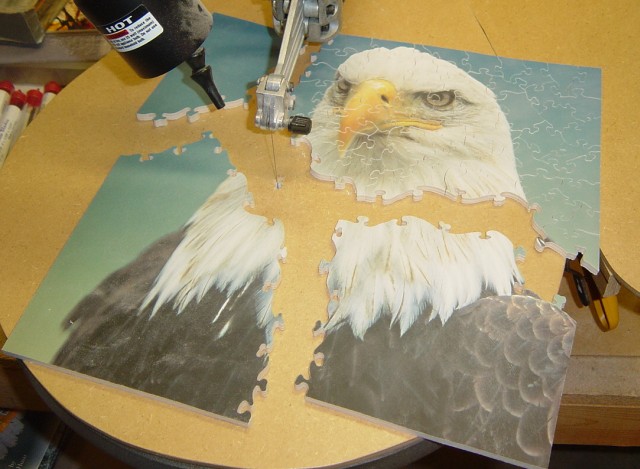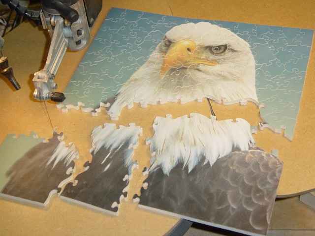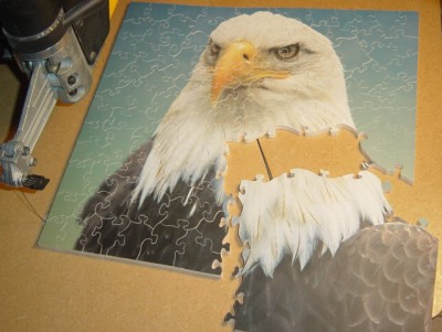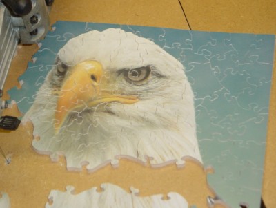 Puzzle complete. 127 pieces. These are easy to handle pieces with an average size of approximately 1.1 sq in. per piece. Other recent eagle puzzles from the same stock were cut with smaller pieces for a more challenging solution.