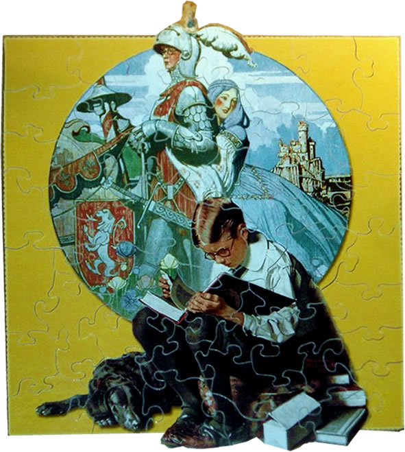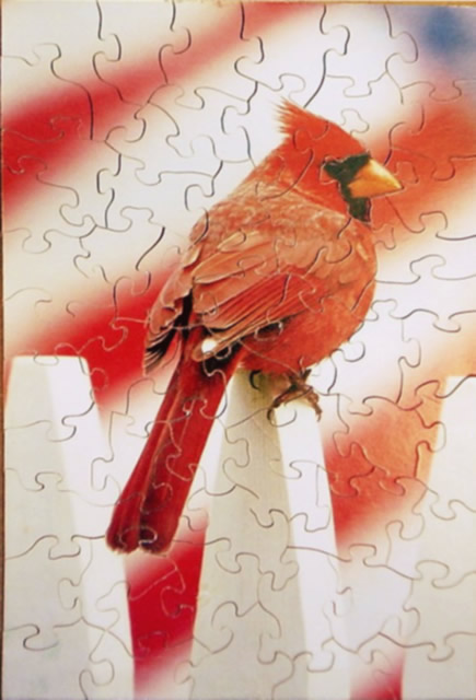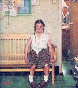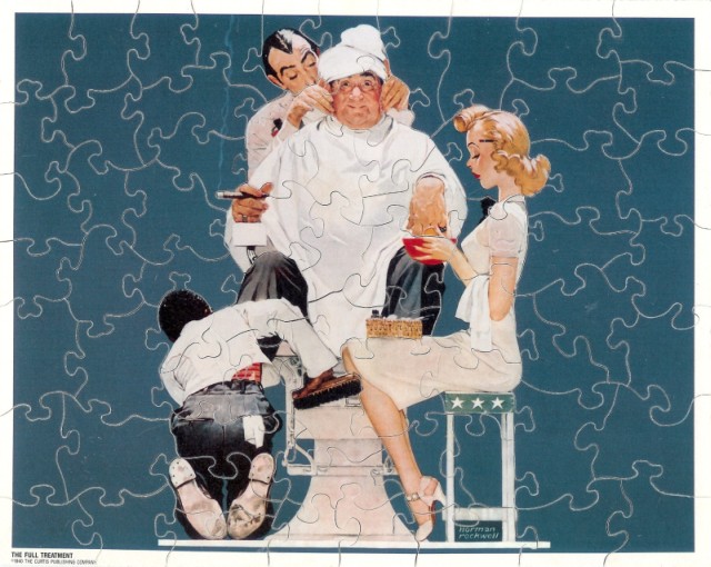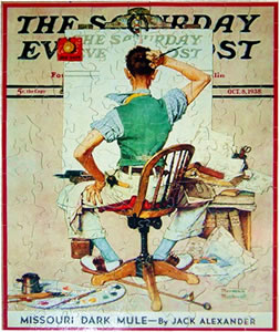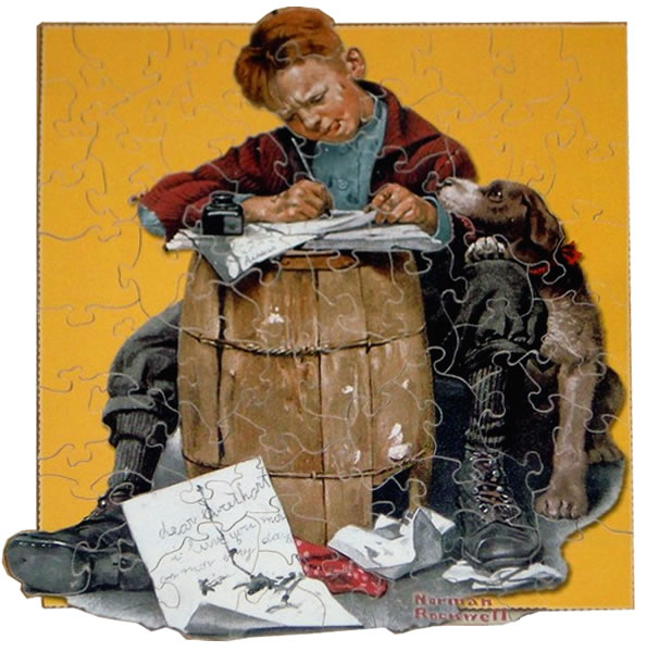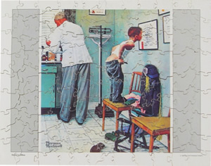 Do you think of friends or family when you see a humorous Norman Rockwell print? The recipient of the "Full Treatment" reminded the giver of her uncle. This puzzle is 7" x 9" and has 67 pieces. Again, a calendar of Rockwell images was the source for this puzzle. |