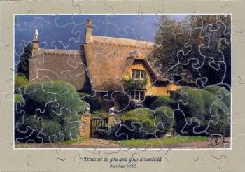 A Greeting Card was used to make this 4" x 6", 47 piece puzzle. The wavy edge adds complexity and may take about 15 minutes to solve depending on puzzle piece size.
